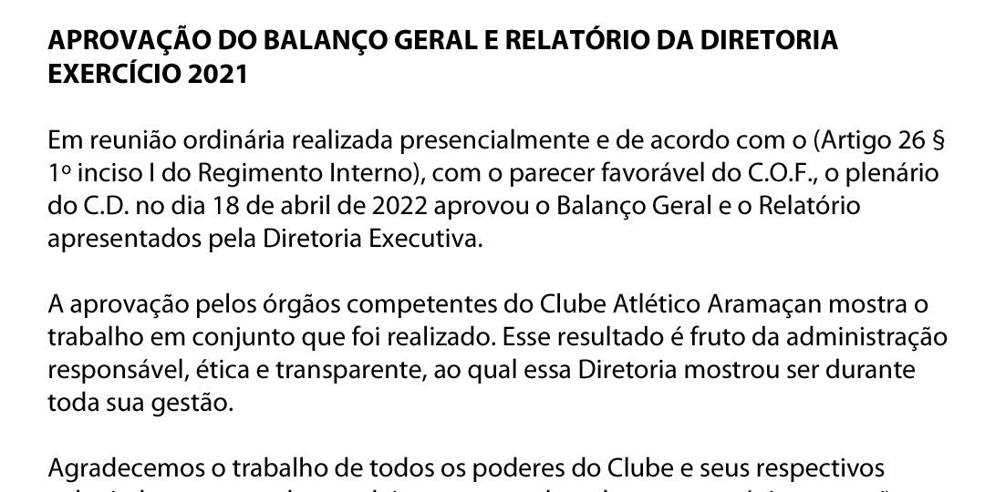 A aprovação pelos órgãos competentes do Clube Atlético Aramaçan mostra o trabalho em conjunto realizado. Esse resultado é fruto da administração responsável, ética e transparente, a qual essa Diretoria mostrou ser durante toda a gestão.